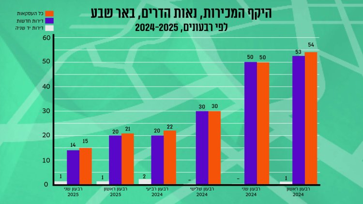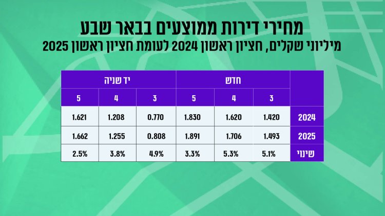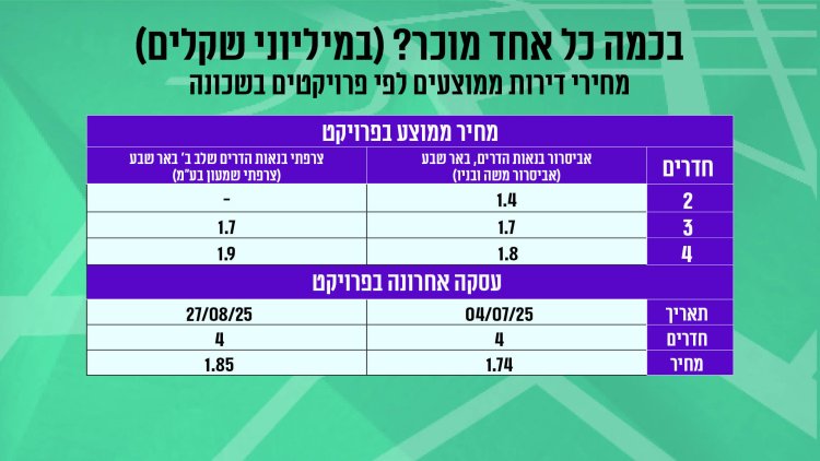 בין החציון הראשון של 2024 לחציון הראשון של 2025 נרשמה בשכונה החדשה עליה של כ-4% במחיר דירה, לצד ירידה של כ-65% בכמות העסקאות בין התקופות. מדובר בעלייה דומה לזו שנרשמה בכלל באר שבע באותה תקופה. וכמה תעלה לכם דירה בשכונה? דירה 3 ידרים חדשה תעלה לכם 1.445 מיליון שקל בממוצע, דירת 4 חדרים תעלה בממוצע 1.772 מיליון שקל. דירת 5 חדרים תעלה לכם בממוצע 1.910 מיליון שקל.