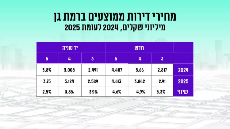 בין 2024 ל-2025 נרשמה בשכונה עליה של כ-3.5% במחיר דירה, לצד ירידה של כ-34% בכמות העסקאות בין התקופות. מדובר בעלייה די דומה במחיר דירה לזו שנרשמה בכלל רמת גן באותה תקופה. על דירת 3 חדרים חדשה בשכונה המתחדשת במרכז רמת גן תשלמו בממוצע 2.75 מיליון שקל, על דירת 4 חדרים חדשה 3.145 מיליון שקל ועל דירת 5 חדרים תשלמו כבר בממוצע 3.745 מיליון שקל. דירת 3 חדרים יד שנייה תעלה לכם בממוצע 2.416 מיליון שקל ודירת 4 חדרים יד שנייה תעלה לכם 2.951 מיליון שקל.