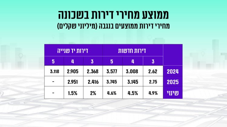 שינוי מחירים (2024 לעומת 2025): עליה של כ-3.5% במחיר דירה. ירידה של כ-34% בכמות העסקאות בין התקופות.