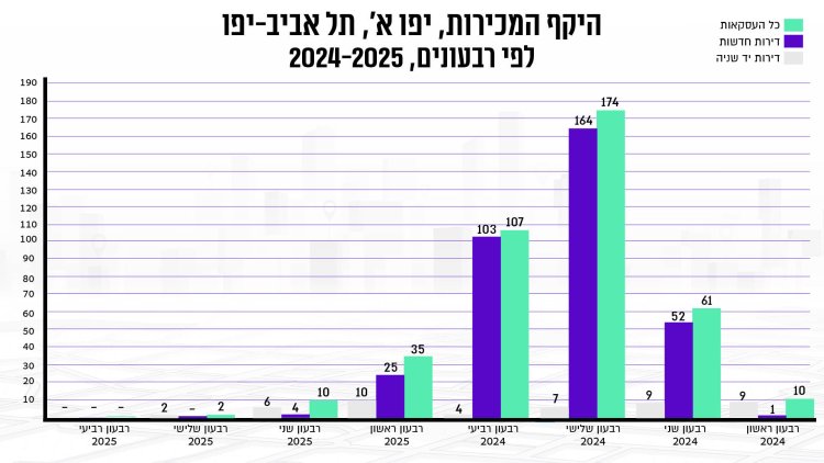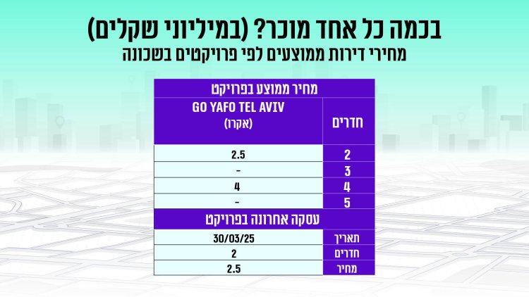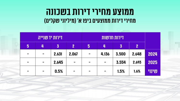 בין 2024 ל-2025 נרשמה ביפו א' עליה של כ-1.2% במחיר ממוצע של דירה, לצד ירידה של כ-86% בכמות העסקאות בין התקופות. מדובר בעלייה דומה במחיר דירה לזו שנרשמה בכלל תל אביב-יפו באותה תקופה. דירת 2 חדרים חדשה ביפו א' תעלה לכם בממוצע 2.693 מיליון שקל, דירת 3 חדרים חדשה תעלה 3.554 מיליון שקל. דירת 3 חדרים יד שנייה בשכונה הוותיקה תעלה 2.645 מיליון שקל. מדובר כמובן במחירים נמוכים משמעותית ביחס למחירים הממוצעים בכלל העיר - הן של דירות חדשות והן דירות יד שנייה. בדירות חדשות הפער עומד על סדר גודל של כ-20%-30% ותלוי במספר החדרים. גם בשוק היד השנייה נרשם פער של 25% עד 35% בממוצע.